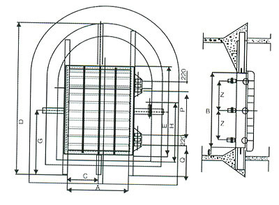 防水密閉門用于井下主變電所和主排水泵房通往井底車場的通道,容易關(guān)閉,以防止水的突然浸入。本密閉門最大承受壓力為98Pa。本密閉門門扇為平鋼板、井字筋板、圈梁等組接而成。